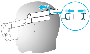 With the battery cradle With the temples Position the strap on top of your head, then pull both sliders outward to tighten the strap.
